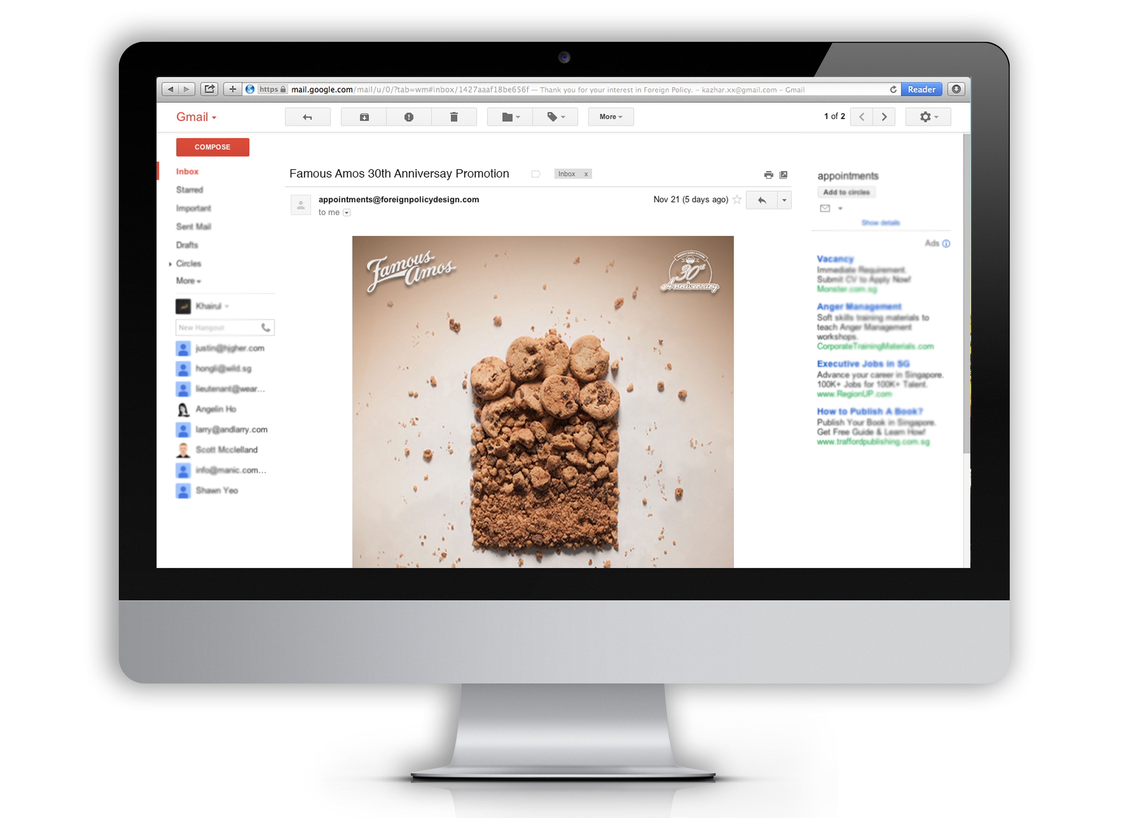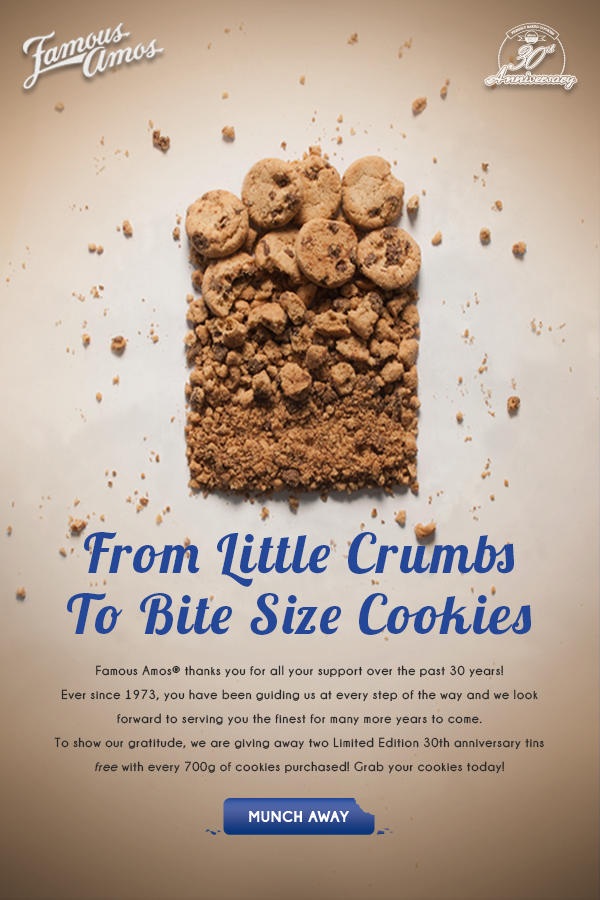This year, Famous Amos turns 30. In conjunction with their anniversary, they will be selling two Famous Amos Limited Edition Tins only available online. The objective was to promote and sell the Famous Amos Limited Edition 30th Anniversary Tins that can be purchase only through the promotional page. I wanted to emphasis on thanking loyal customers for being there throughout the years from little crumbs to bite size cookies.
