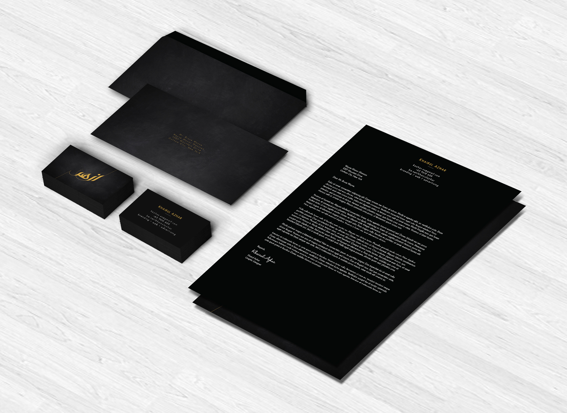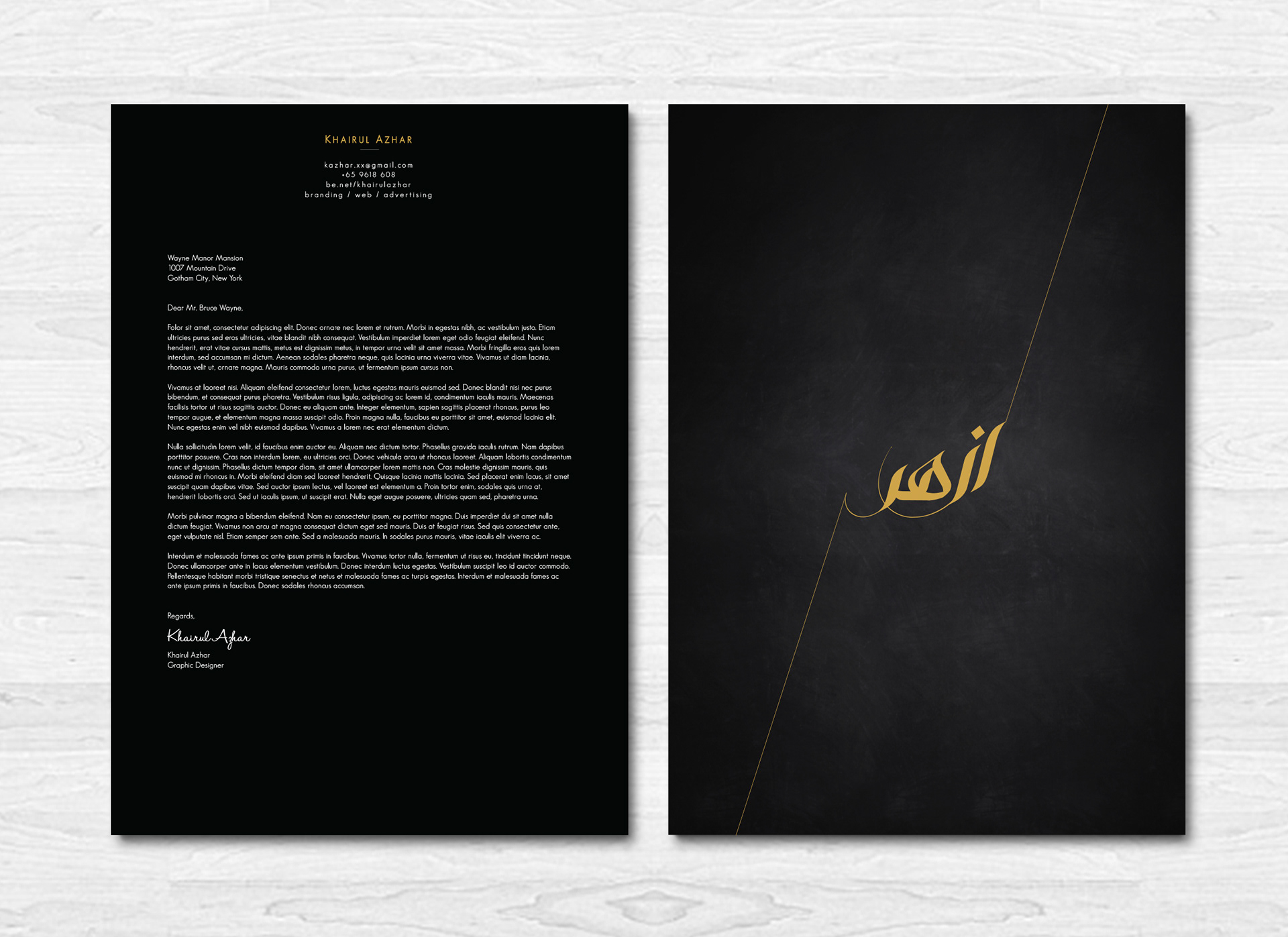 Reflecting confidence, precision and perfection, i believe my logo reveals creativity in its design. I decided to use caligraphy because I wanted to stick to my roots and traditions. The idea was to have a mixture of eastern and western feel to its design. I feel that I have an expensive taste in things and an overall a mysterious person. Hence, the colours black and gold were chosen.