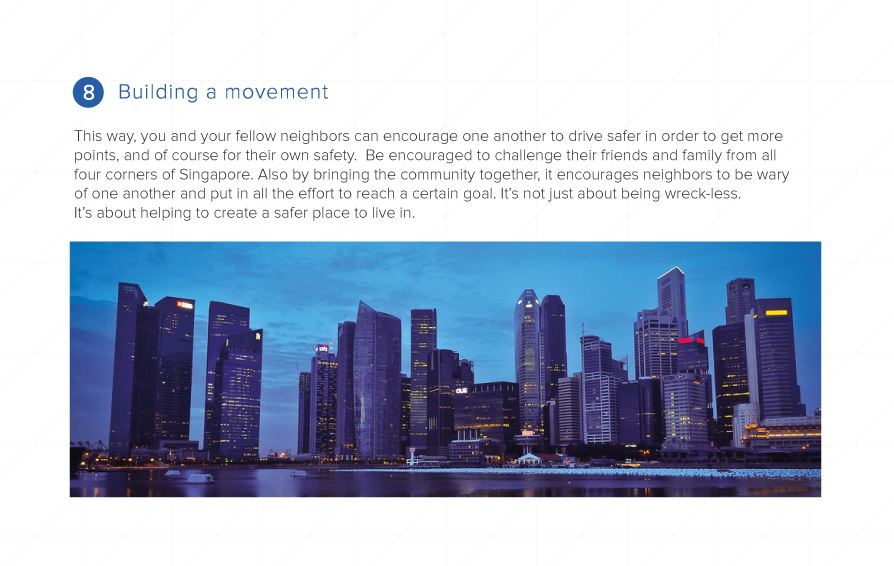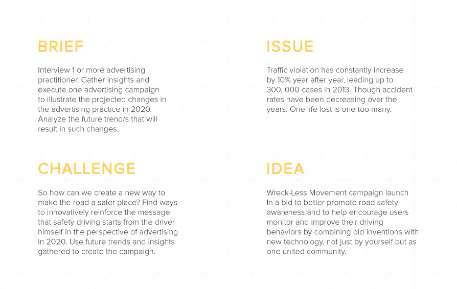 Wreck-Less Movement campaign launch In a bid to better promote road safety awareness and to help encourage users monitor and improve their driving behaviors by combining old inventions with new technology, not just by yourself but as one united community. Advertising Communications CA2 DVMD, Singapore Polytechnic